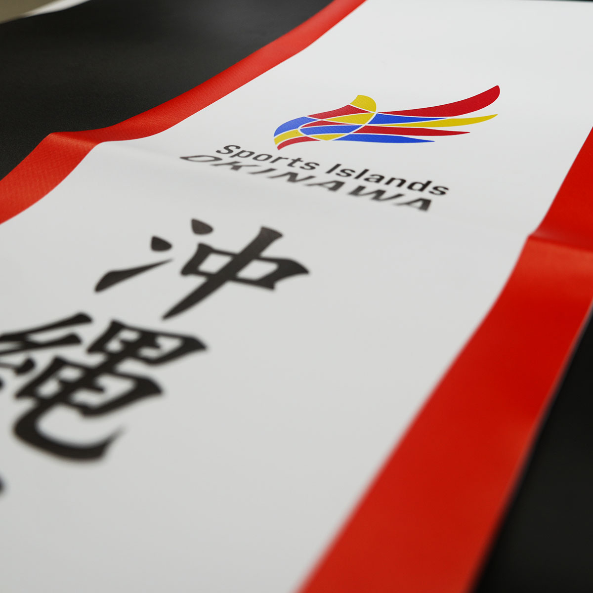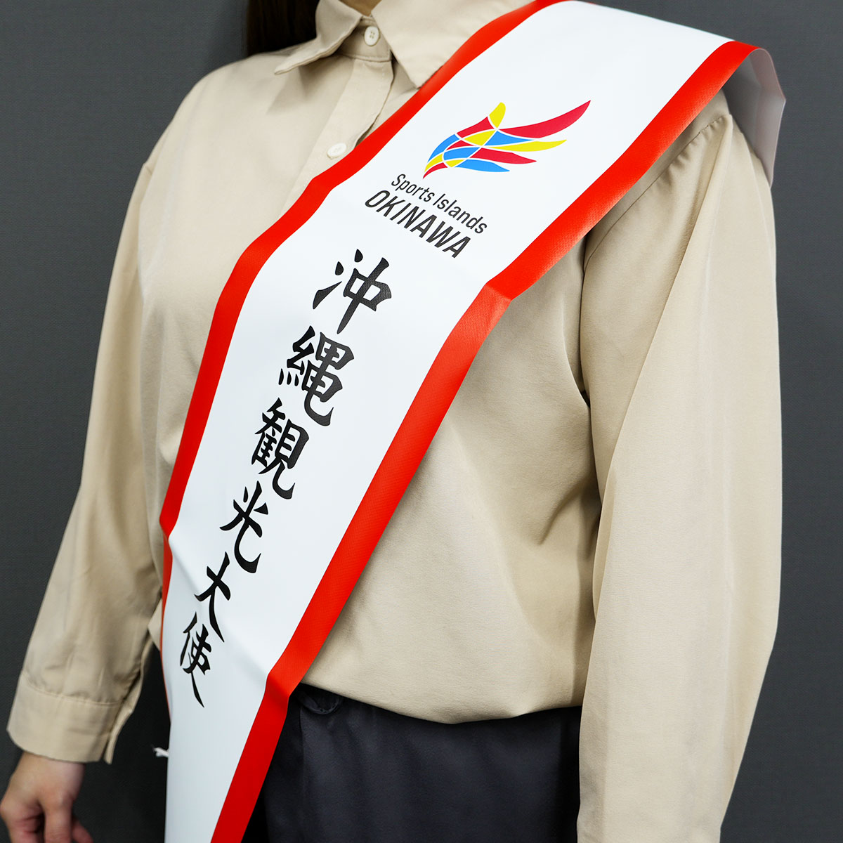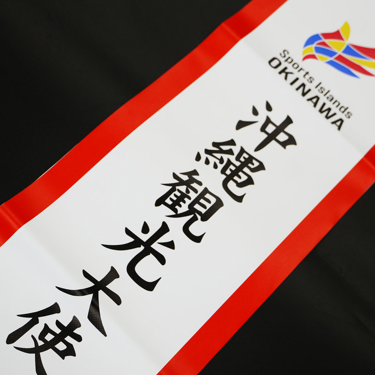 県外のマラソン大会にて、沖縄観光大使がスポーツアイランド沖縄PRランナーとして着用。「Sports Islands OKINAWA」のロゴや、沖縄観光大使という肩書きをタスキに印刷することで、多くの人に強い印象を与える効果的なツールです。