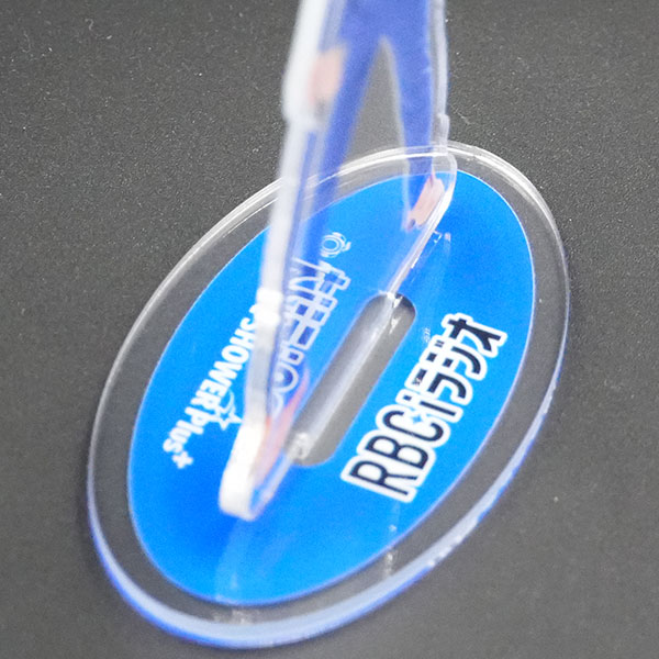 人物のアクリルスタンドなので、本体の縁や台座のロゴの端は白地を入れず透明にする事で、まるで小さな嘉大雅アナがデスクにいるような感覚を楽しめます。