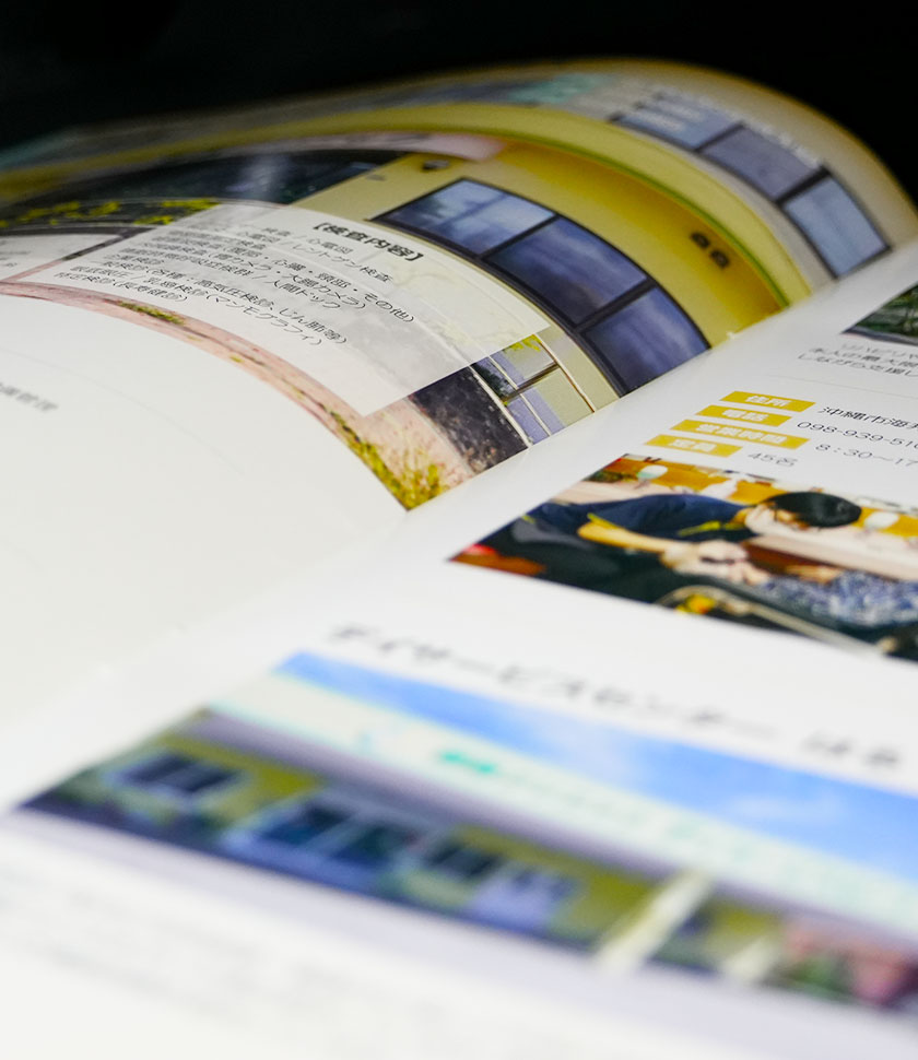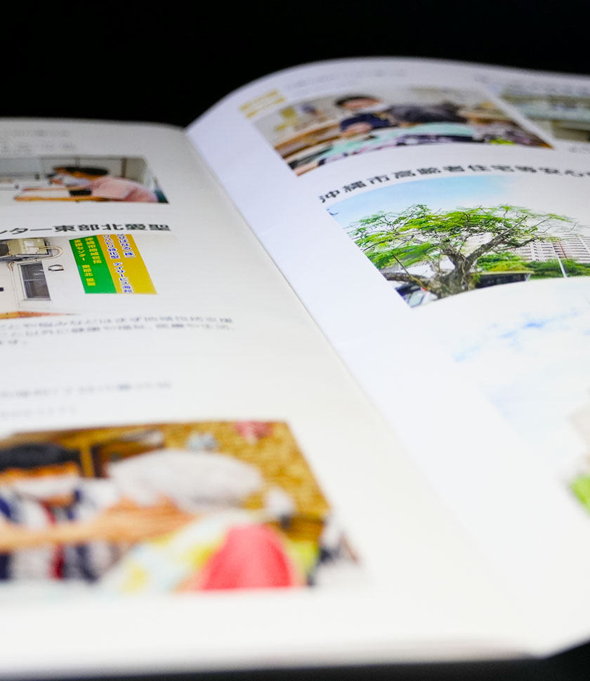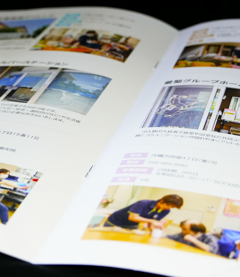事前にレイアウト案を作成し、それに合わせて写真撮影及びデザイン作成を行いました。どのページにどんな施設が載っているか?が一目で分かるように「クリニック」「介護施設」「福祉施設など」各カテゴリに合わせて色分けしています。